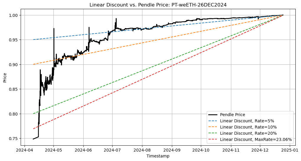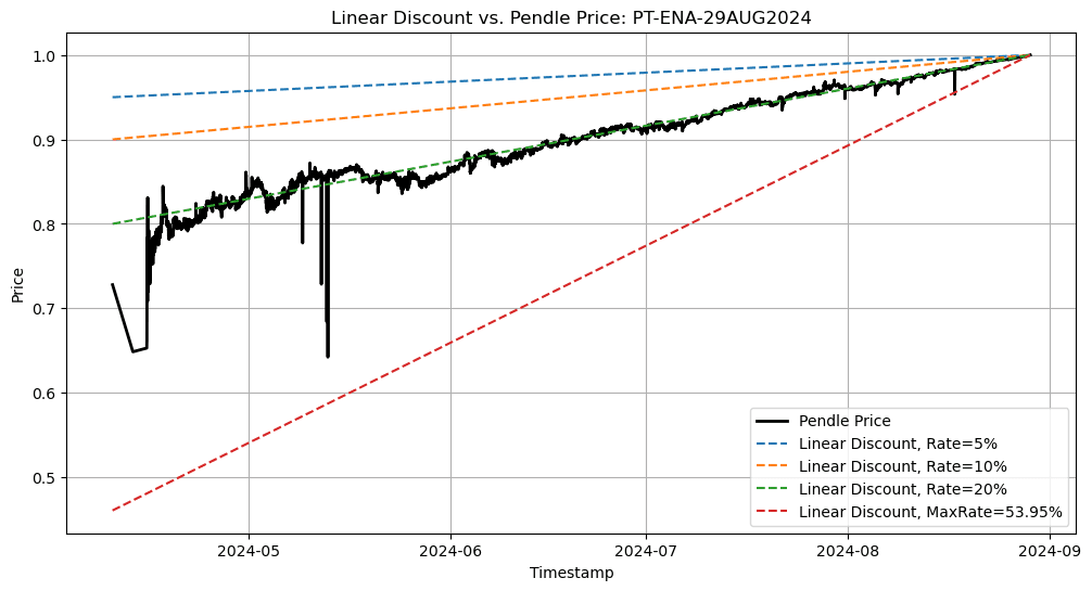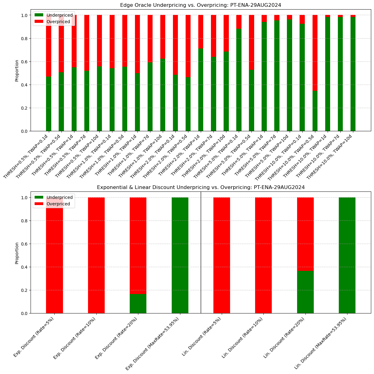 The LLB Linear Discount model employs a single rate parameter. By default, Pendle sets MaxRate to mitigate overpricing risk; using a custom rate may introduce risks, as seen with PT-ENA, although overpricing is minimal with the default value. Therefore, while it was pointed out that baseDiscountPerYear can trade significantly above the market price due to potential downward price volatility, discounting with a MaxRate demonstrates minimal overpricing even in downward pricing shocks. The observed sharp PT-ENA price movements support this example.