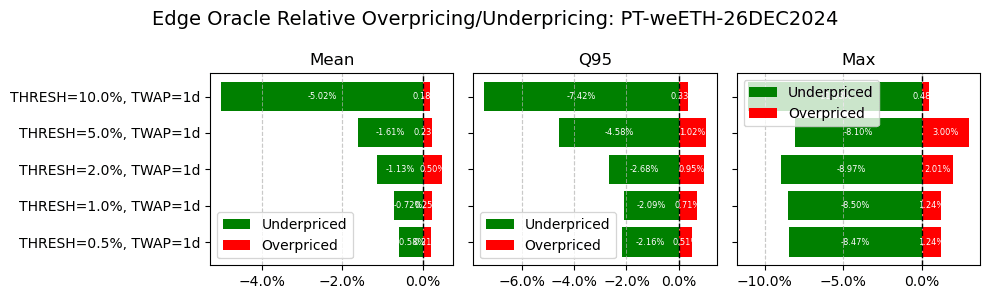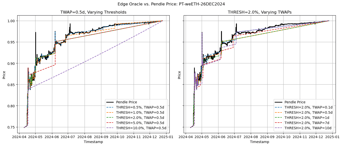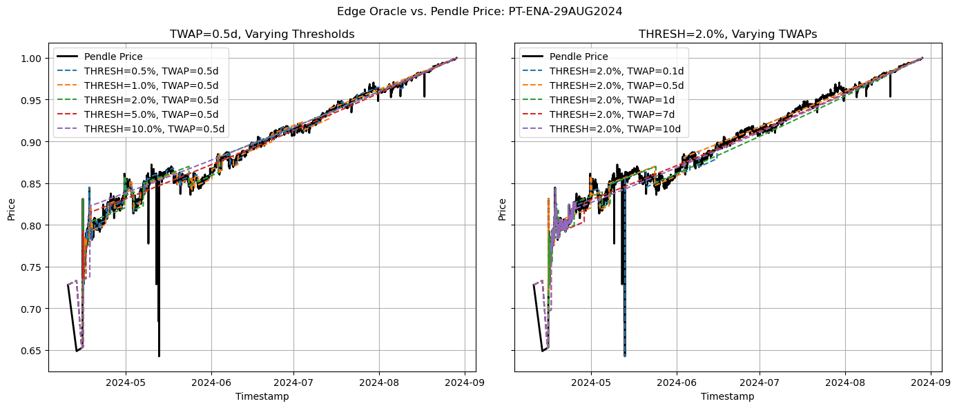 The Edge PT Oracle adjusts prices when the reported lnImpliedRate deviates beyond a predefined threshold combined with TWAP parameters. These settings can be tailored per asset, allowing us to examine their sensitivity and impact on Oracle’s reported price.
