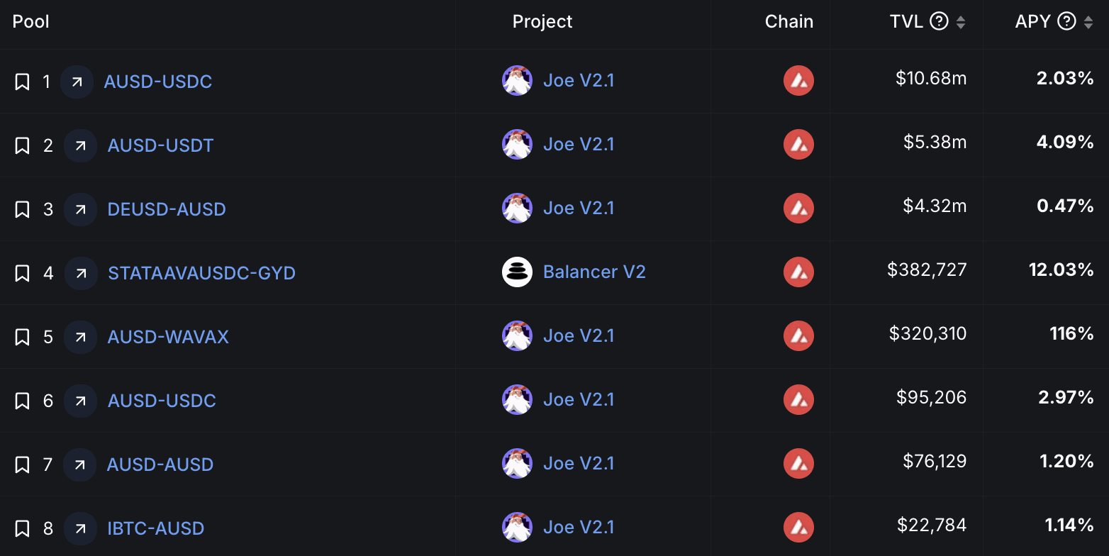 There is currently around 7.5M AUSD to be sold for USDC within a 6% price impact. The liquidity mainly resides in 3 Joe V2.1 pools where AUSD is paired with USDC, USDT, and deUSD for a total TVL of ~$20M. As indicated by Chaos Labs, the asset’s liquidity has been stable at these levels for the past months.