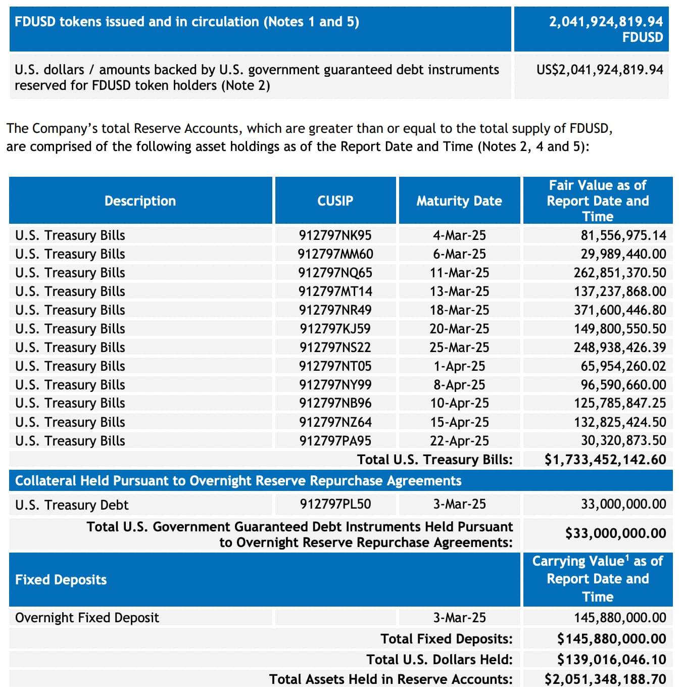 The latest attestation report of fdUSD reserves is from February 28, 2025. They commit to monthly attestation reporting with an 18 day delay on each month’s reporting. There is a notable deficiency in the attestation reporting that they do not disclose the financial institutions where the reserves are held.