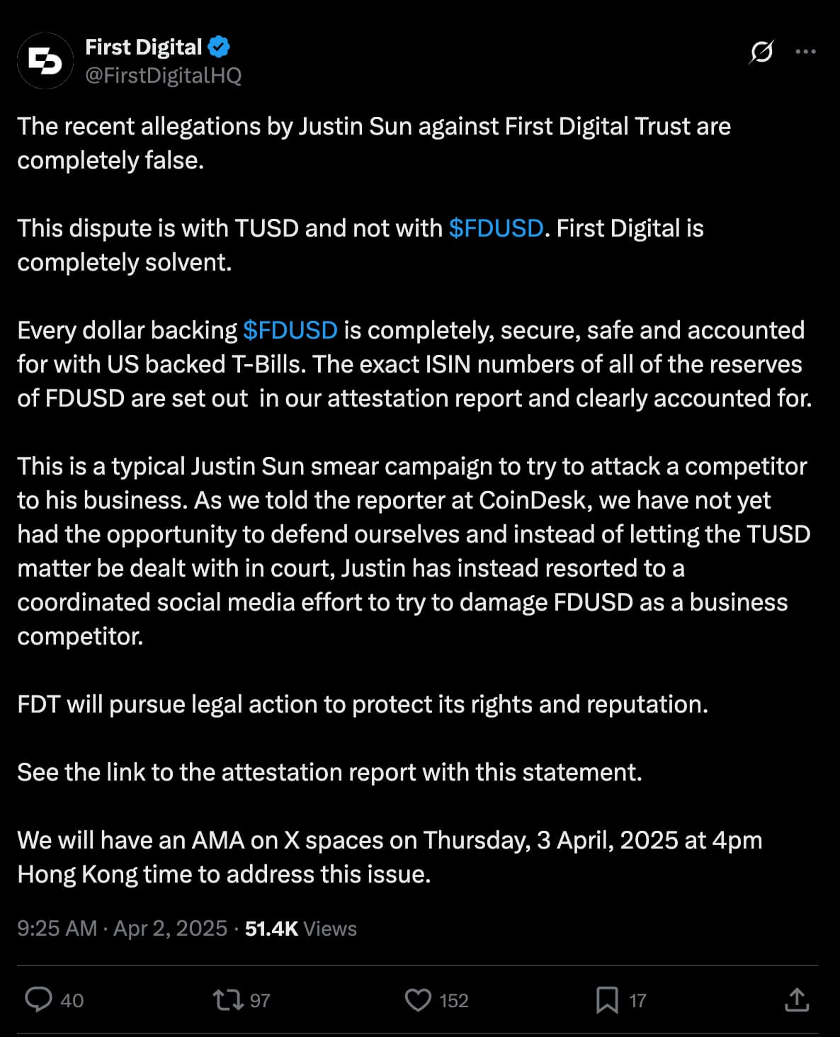 First Digital is actively responding to the allegations made by Justin Sun. They deny the allegation in this Twitter post. They have also responded by addressing the allegations in a recent Twitter Spaces.