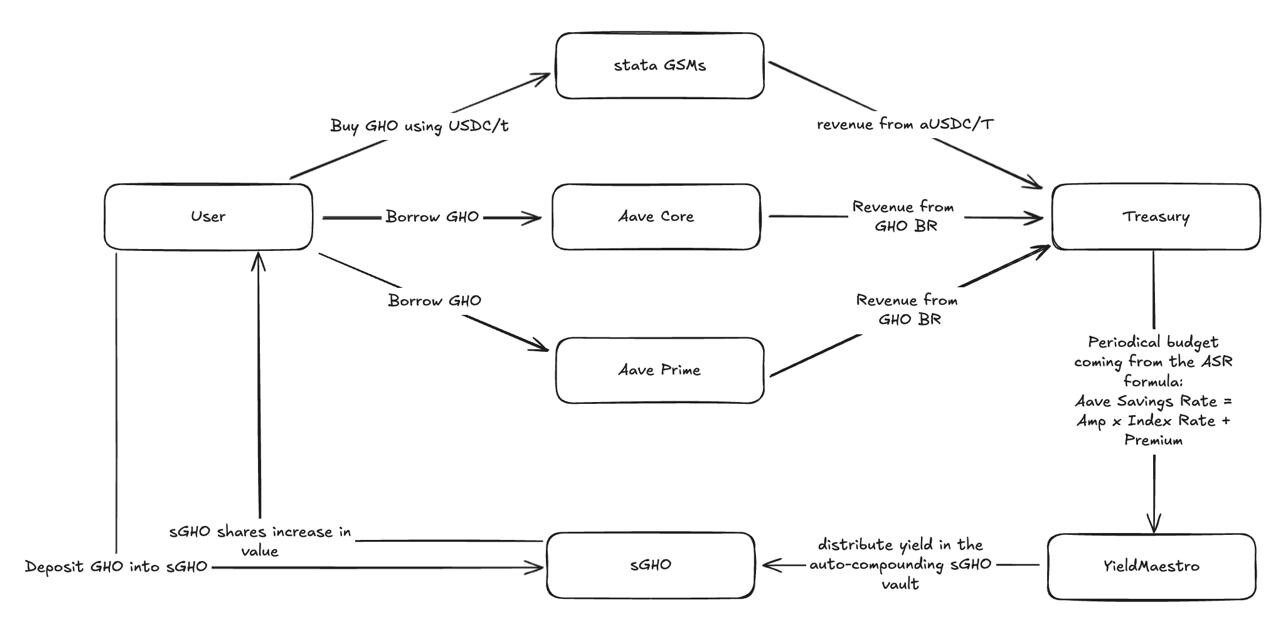 The origination of GHO deposited to the sGHO vault is made available via two different entry points: 1) GHO minted/borrowed on Aave’s lending markets, and 2) GHO issued via stataGSMs. These actions will result in revenue for the DAO, which will fund the ASR yield distributions.