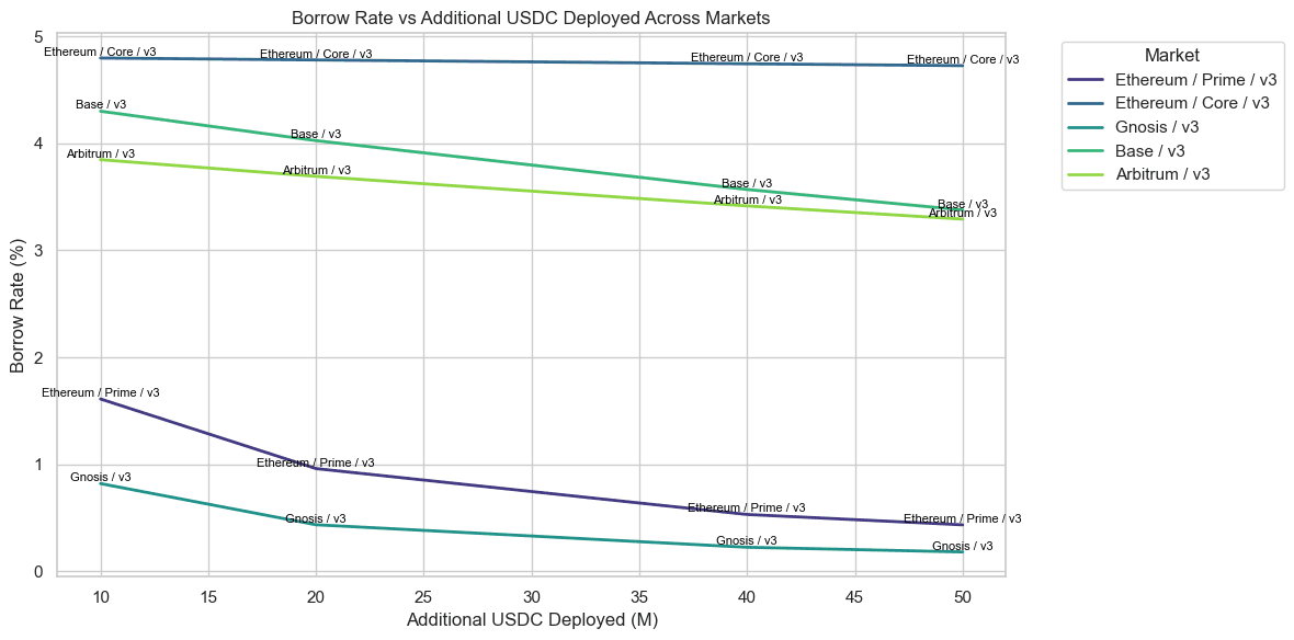 Since late 2024, the relationship between GHO borrow rates and broader market borrow rates has been unchanged. GHO’s borrow rate is configured to be at a slight discount or on par with the USDC and other stablecoins borrow rates on Aave’s Core market. Therefore, to achieve an ASR slightly above GHO borrow rates, exceeding the USDC borrow rate will be needed.