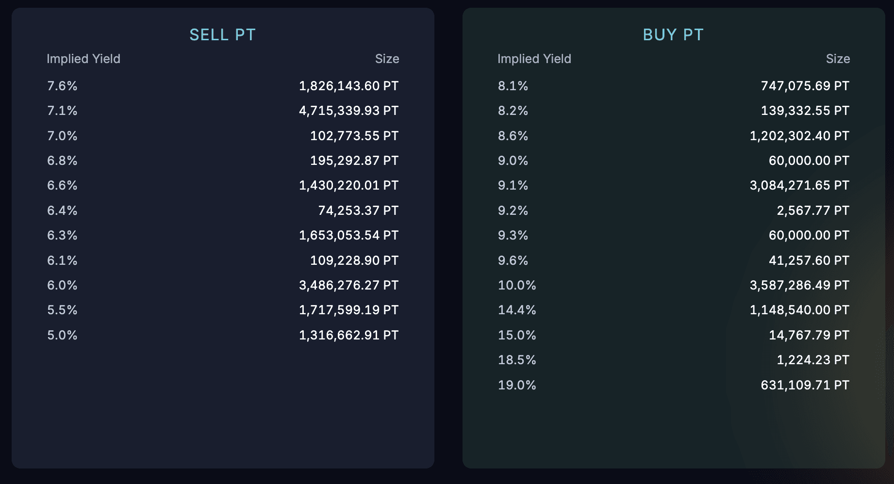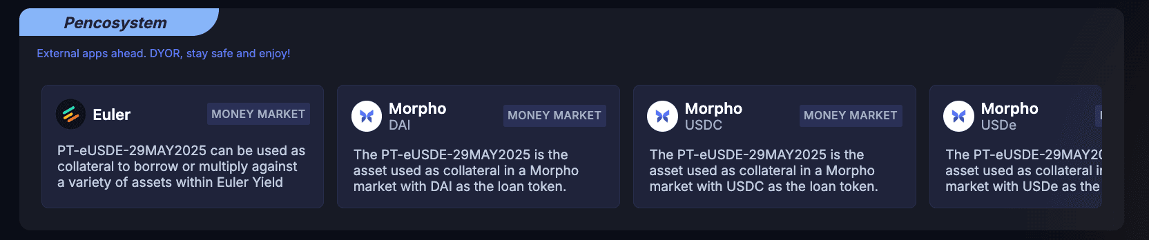 For eUSDe PT tokens, the yield is implied through buying at a discount and redeeming at par value at maturity, as is typical in Pendle Finance’s principal token structure. The PT token represents the right to redeem the underlying eUSDe at maturity, capturing the fixed yield based on the discount at purchase.