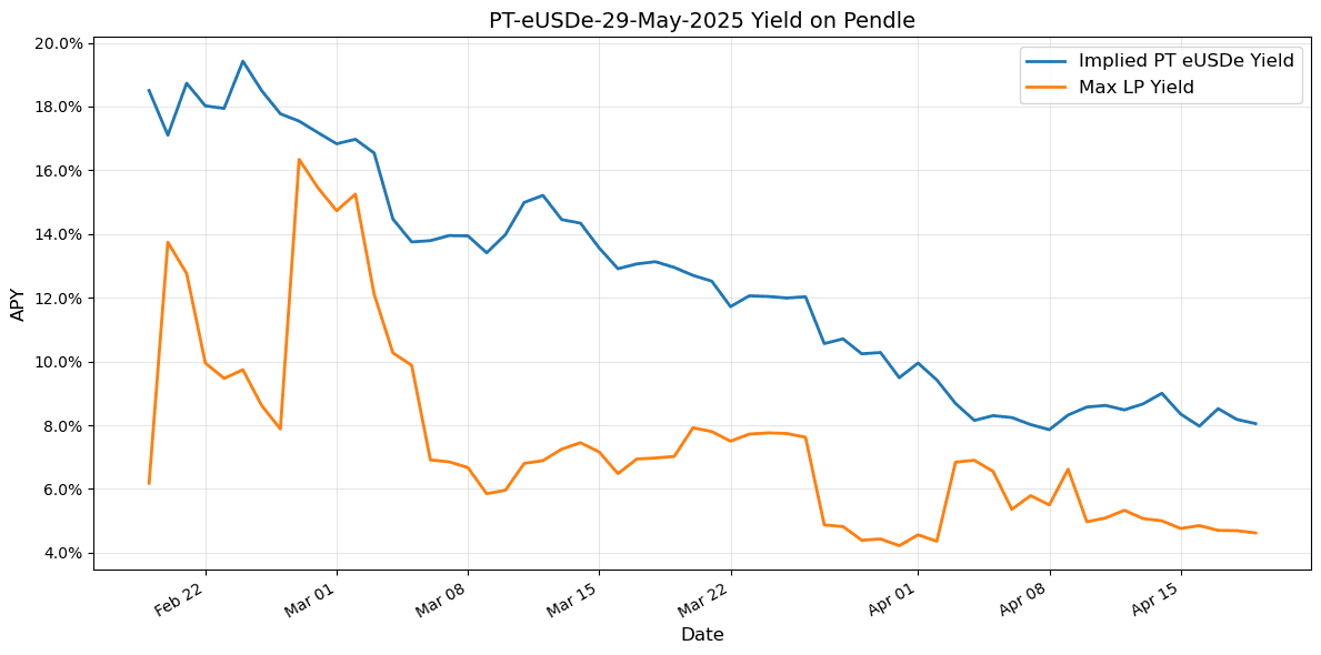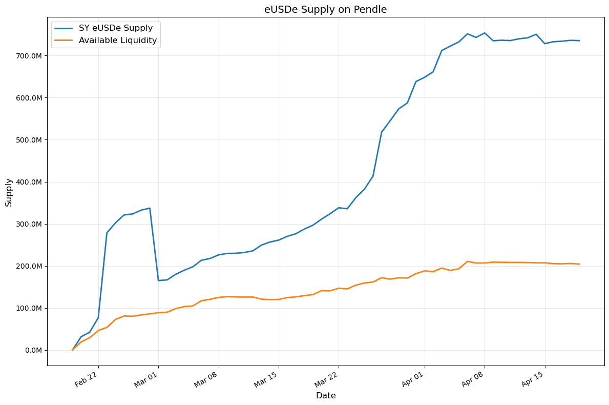 Since the beginning of April, as the pool has matured and market conditions have changed, the SY eUSDe supply has subdued at ~730M. At the same time, available pool liquidity has been slowly reducing and flattened at ~200M. The difference between these values roughly represents the supply of PT eUSDe, with PT eUSDe being part of the available liquidity amount. This equates to a total PT eUSDe supply of 550M tokens.