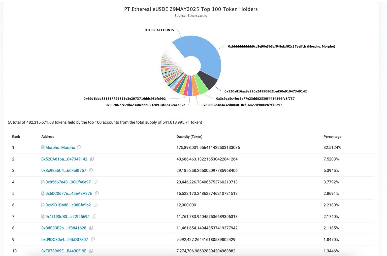 The PT eUSDe token holder distribution reveals a notably high concentration among a few addresses. The top 10 holders collectively control approximately 91% of the total token supply. More than 30% of the token eUSDe PT supply ($176M) currently resides on Morpho. The second and third largest holders are not contracts. However, their identities cannot be attributed to a particular entity/project/team.