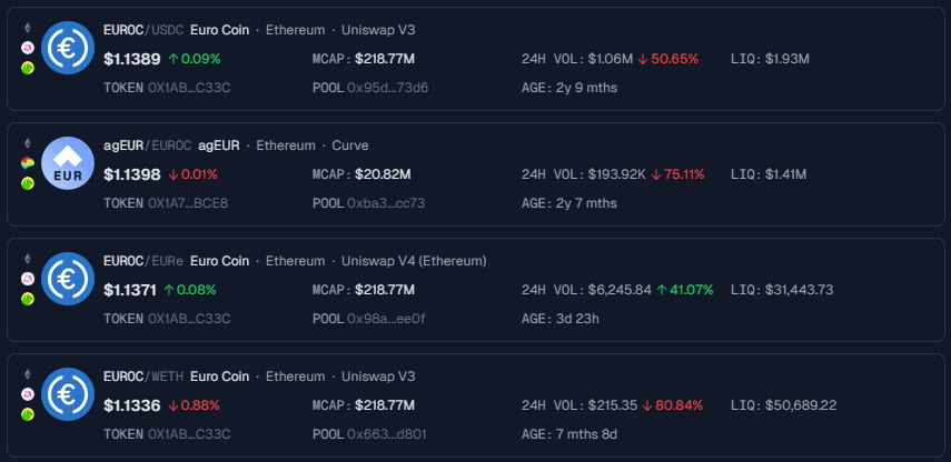 Source: EURC Liquidity Pools on Ethereum, GeckoTerminal, April 19, 2025.