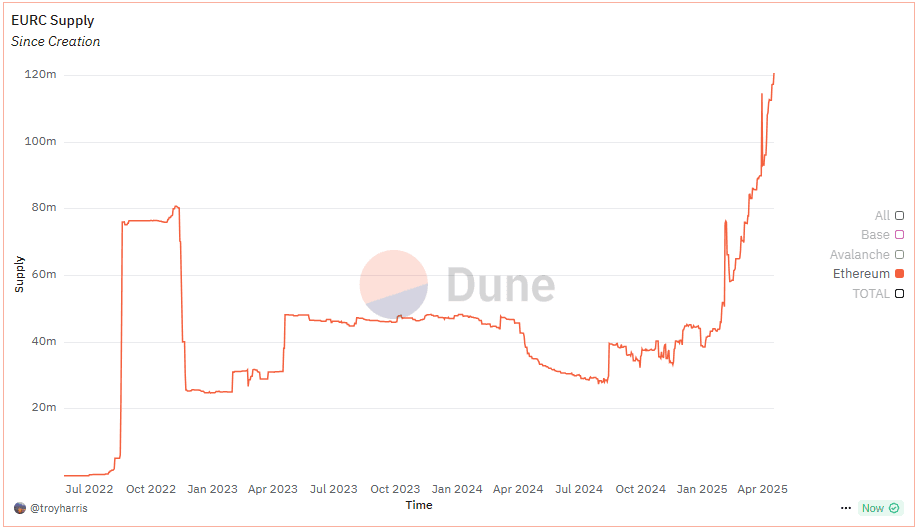EURC’s circulating supply on Ethereum has reached an all-time high of 120.7M, nearly tripling from 39M in just 108 days since the start of the year, and continues to grow steadily. This growth may be attributed to a weakening dollar against the euro, heightened USD volatility, and increased demand for diversification in stablecoin holdings among institutional players.