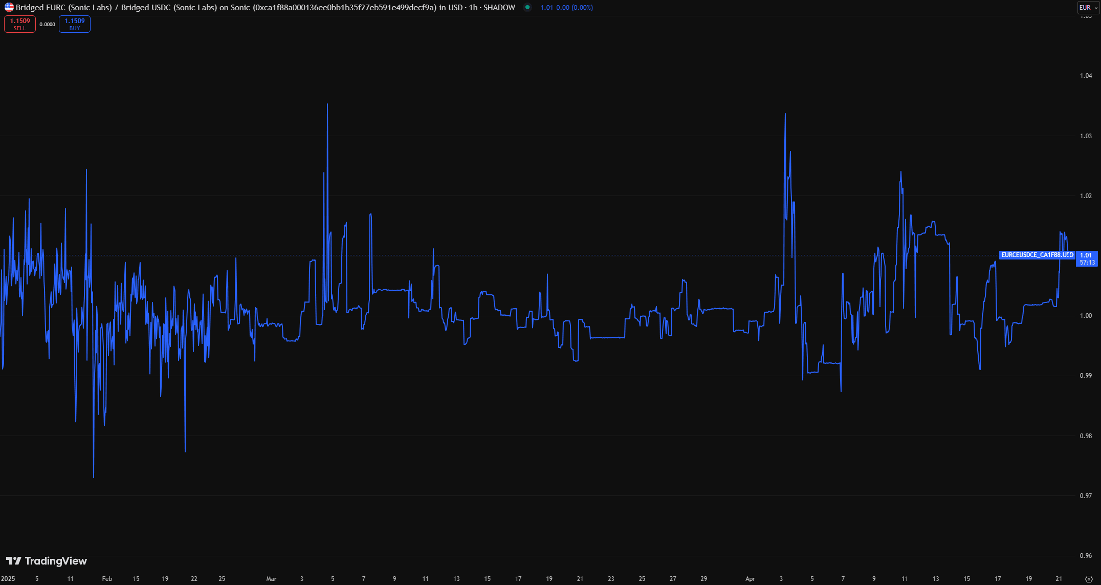 EURC is currently trading at a 1% premium in secondary markets (Shadow Exchange) on Sonic. On multiple occasions, the EURC/EUR ratio has deviated by over 1%, highlighting volatility driven primarily by low liquidity on Sonic DEXs.