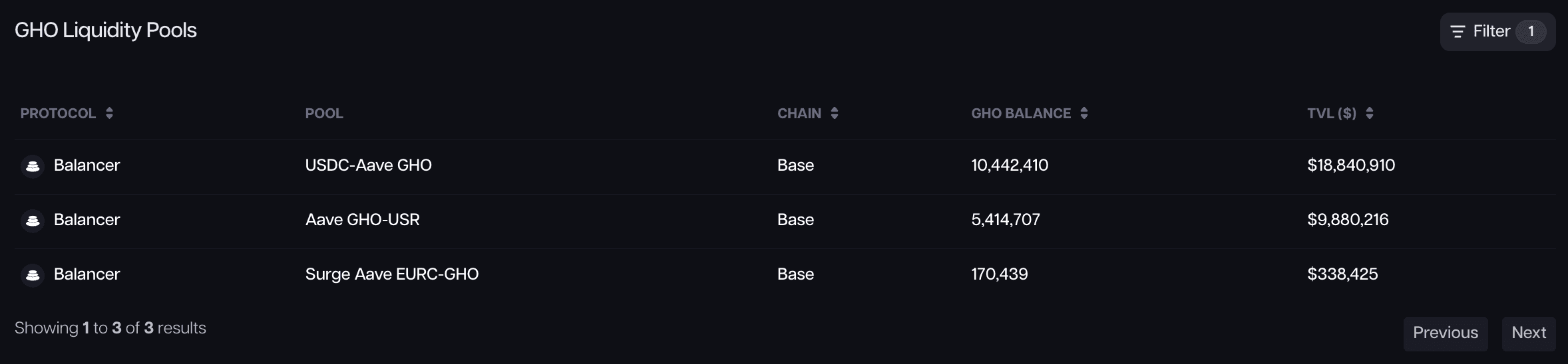 The proposed increase to a 1.5M GHO rate limit and a 300 GHO/second refill rate represents a five-fold enhancement. While substantially larger, this new capacity does not introduce immediate risks to GHO’s secondary market peg. The liquidity on Base is now sufficiently developed to absorb larger transfer volumes without significant price impact. The total GHO liquidity TVL on Base now stands at ~$28M, mainly concentrated on Balancer pools and paired with USDC, USR, and EURC.