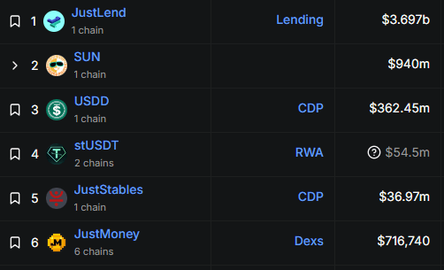 DEXs: SUN.io (SUNswap, SUNcurve, SunPump) ($940M), Just Money ($717K), Intercroneswap ($298K), Socialswap ($282K), Bridgers ($81K)