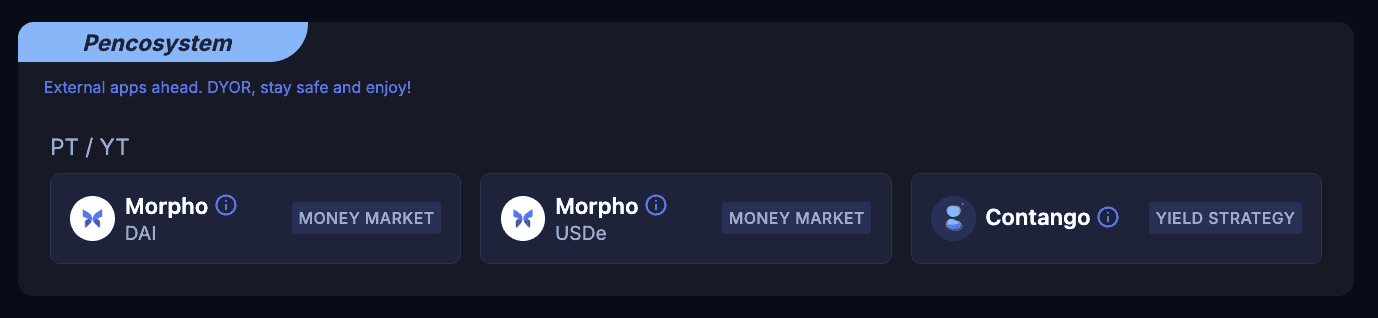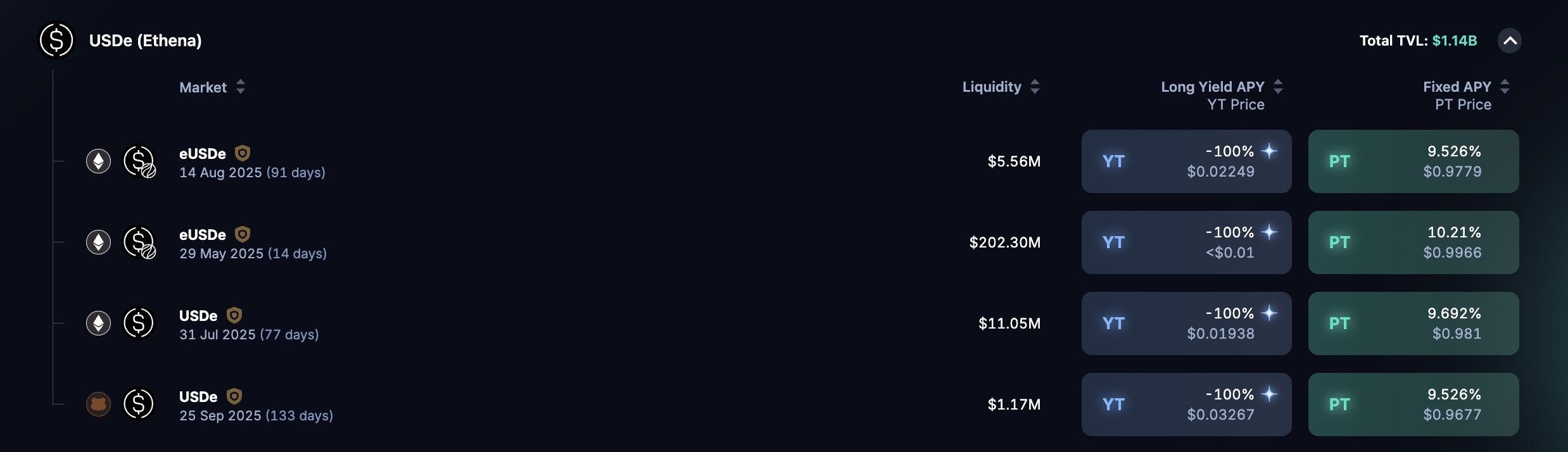 For PT-USDe tokens, the yield is implied through purchasing at a discount and redeeming at par value at maturity, as is standard in Pendle’s principal token structure. The PT token represents the right to redeem the underlying USDe at maturity, capturing the fixed yield based on the discounted purchase.