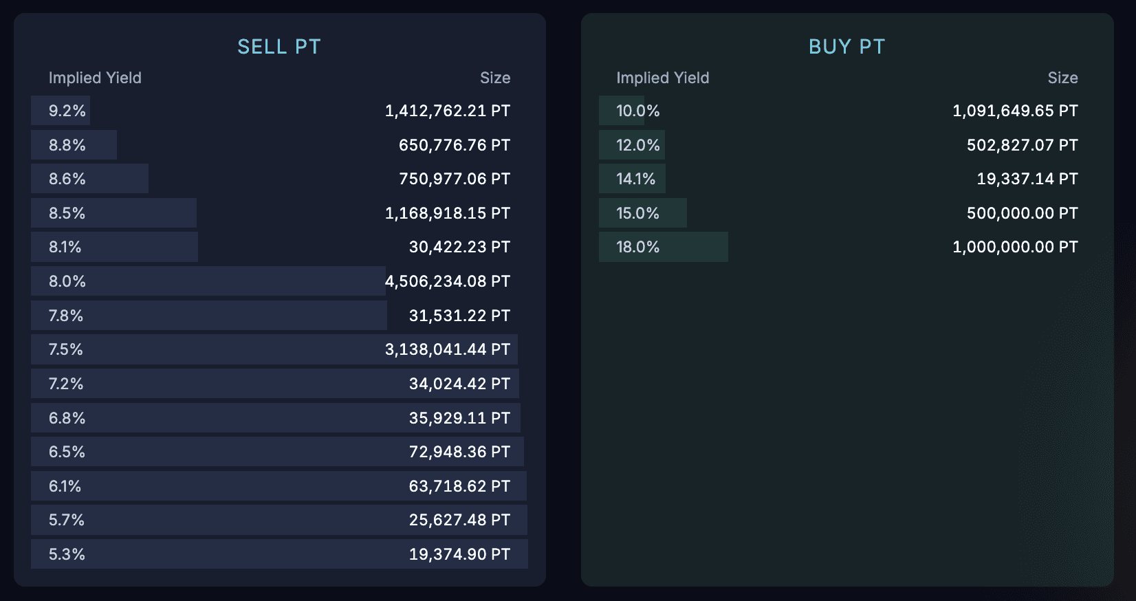 The market’s order book composition also suggests lower trading activity, with a bid-ask spread at 0.28 of implied yield. Overall, a smaller bid side liquidity is apparent, amounting to 3.1M PT tokens in total. This may also explain recent aggressive implied yield changes.