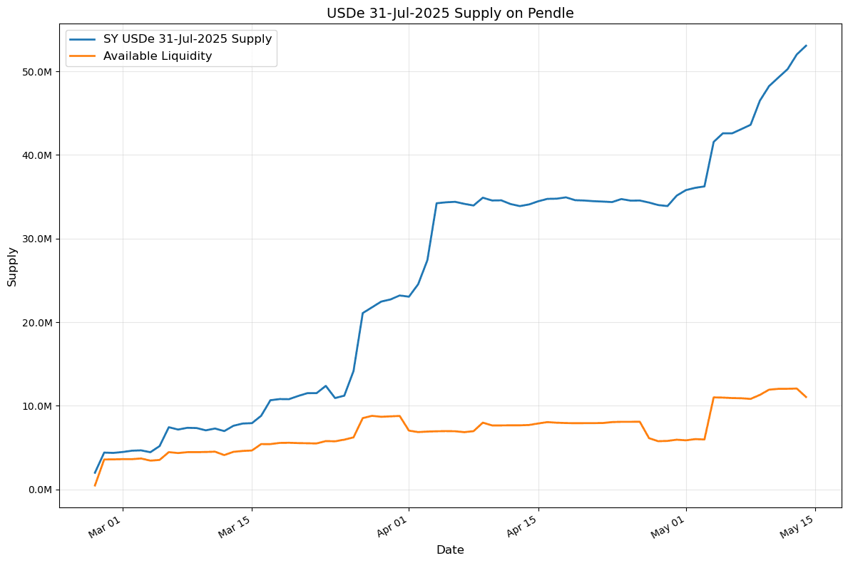 The PT-USDE-31JULY2025 is the sole USDe maturity pool available on the Ethereum market. An additional but negligibly sized pool ($1M liquidity) is available on Bera chain Pendle deployment. The historical availability of PT USDe markets indicates that user interest has been and is expected to remain stable.