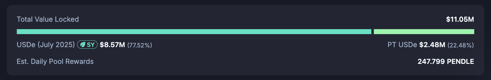 As mentioned above, the PT-USDe pool maintains an estimated liquidity of $11M. 77.5% is held in SY USDe, while the remaining 22.5% is in PT USDe tokens. Liquidity is lower than eUSDe and sUSDe Pendle markets, indicating less user interest in PT USDe.