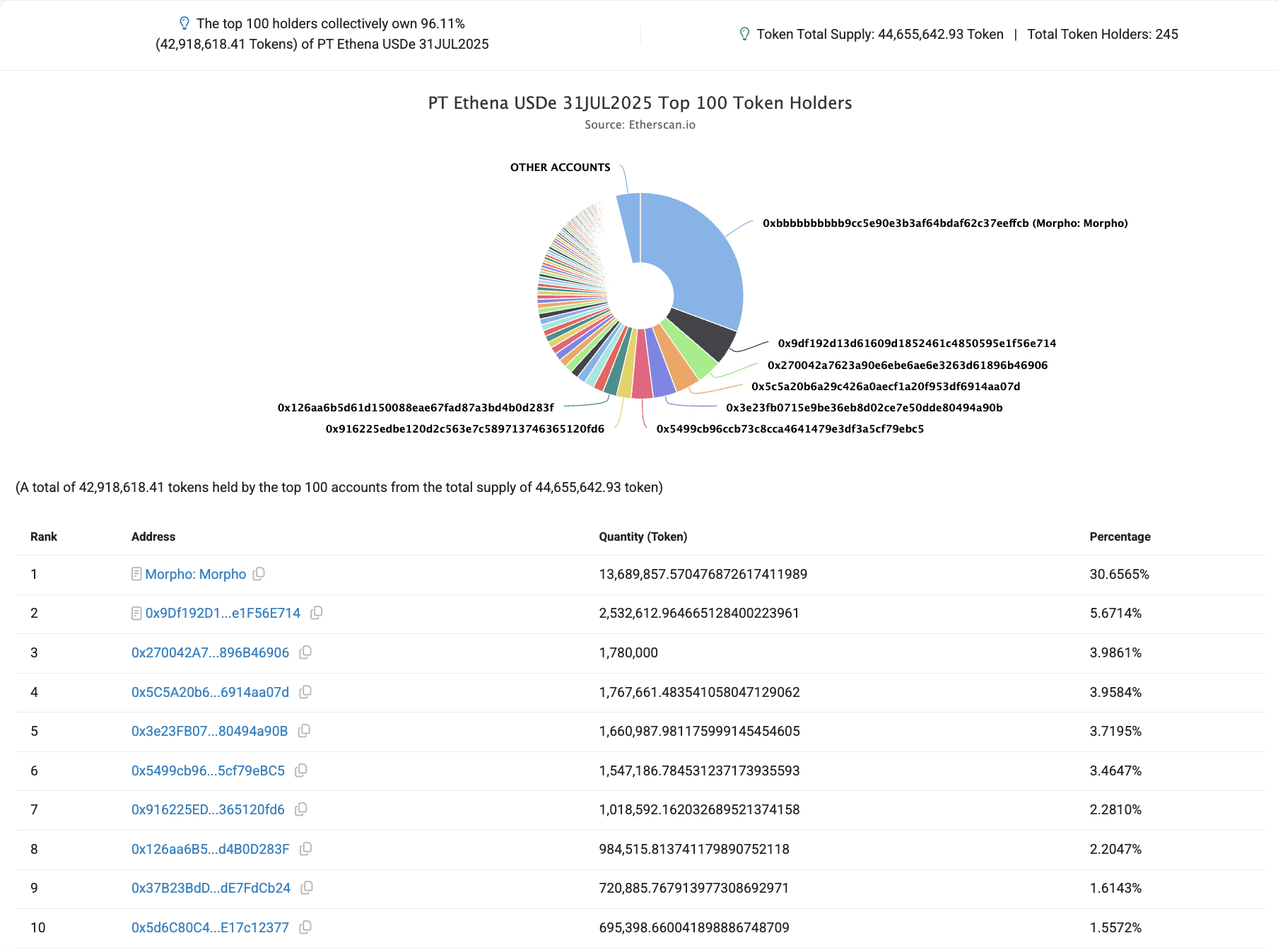 The PT-USDE-31JULY2025 token holder distribution is diverse and decentralized, with the largest holder being Morpho protocol with 30.65% of the total asset supply. Pendle’s liquidity pool is the second largest holder, with 5.67% of PT’s supply. The 10 largest holders collectively hold ~59.1% of the asset’s supply.