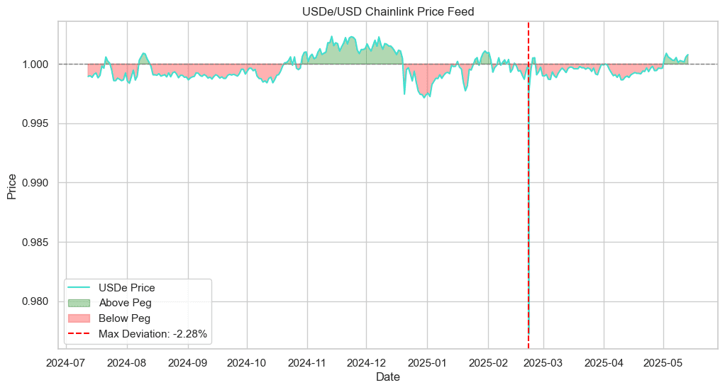 The stability of USDe depends on solvency and collateralization. Nonetheless, it can also be affected by broader market stress. To provide full collateralization and coverage against market, centralization, and collateral risks, the reserve fund with ~$60M of highly liquid assets has been accumulated. Historically, the secondary market peg of USDe has remained stable, with an expectation of temporary stress events, the most recent being the Bybit exploit incident. The secondary market discount of USDe has not exceeded 20 bps since then.