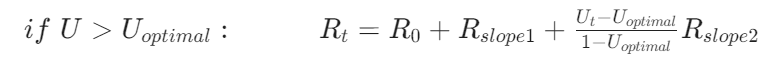 - Above Optimal Utilization: The interest rate increases sharply once the utilization rate surpasses the optimal threshold. This significant rise discourages excessive borrowing and encourages repayments, thereby protecting the liquidity pool from being over-leveraged. The formula for this segment ensures a sharp escalation in interest rates to maintain stability within the liquidity pool.