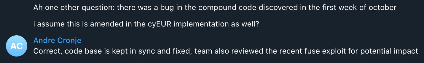We corresponded with Andre Cronje about the amendment to cyEUR and cyASSET token implementation upgrades following Compound’s security breaches and bugs found in 2021.