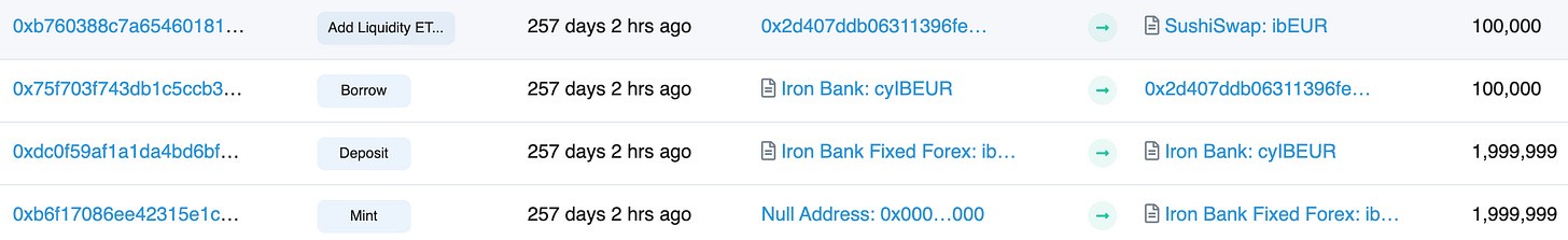 Having said that, we don’t see any immediate rugpull threat from Fixed Forex itself; the Keep3r multisig which manages Fixed Forex has very limited power once an ibToken is deployed. The Iron Bank multisig has much more capability to rugpull but that can be considered out-of-scope.