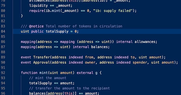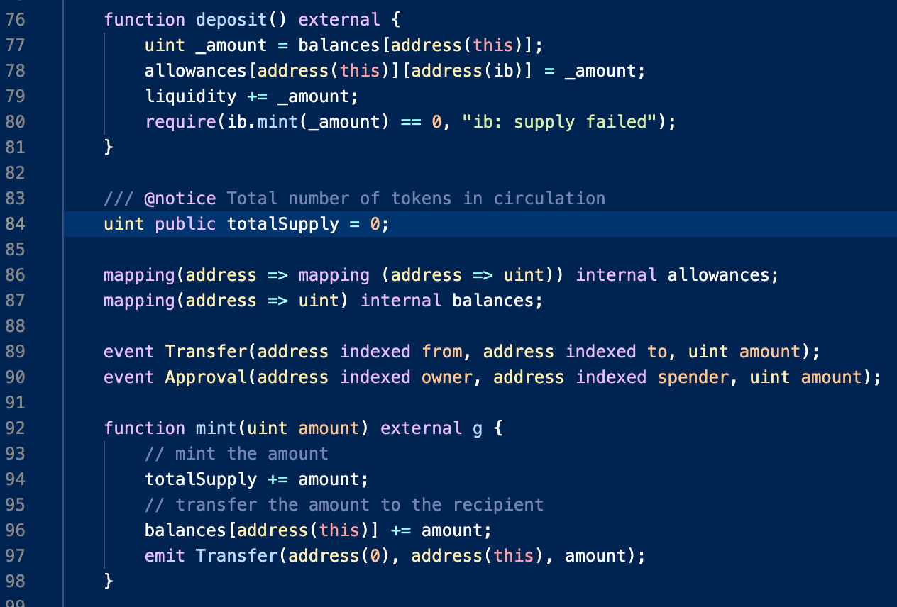 The deposit function deposits the contract’s entire balance into the cyToken corresponding to the ibToken. The cyToken is given as the ib property in the ibToken contract. In the case of ibEUR (our example), ib points to Yearn’s cyEUR token contract deployed by Cream Finance.