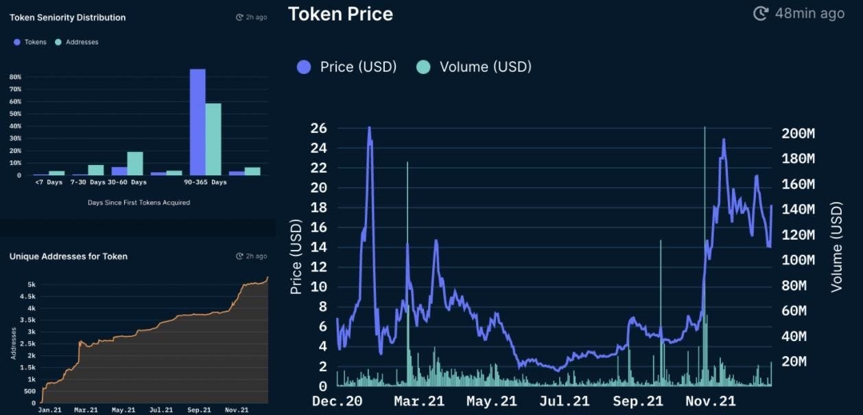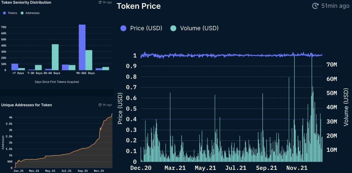 Looking at FXS we can see a majority of FXS holders is holding for a long time however the unique address distribution seems in a healthy uptrend. The trading volume seems a bit on the low side, this can increase once AMOs yield will go up plus the demand for FXS will increase.
