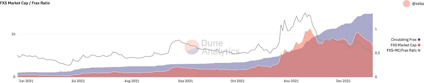 The total value of the FRAX minted must be equal to the total value of the collateral at the CR and the value of the FXS (which will be burned). When FRAX is redeemed, users will receive back the collateral and the amount of FXS at equal value (this FXS is minted). FXS share in the Frax protocol has unlimited aggregate supply, FRAX offloads its volatility to the FXS token. The graph below shows us that there is a healthy amount of FXS to back up the FRAX market cap.