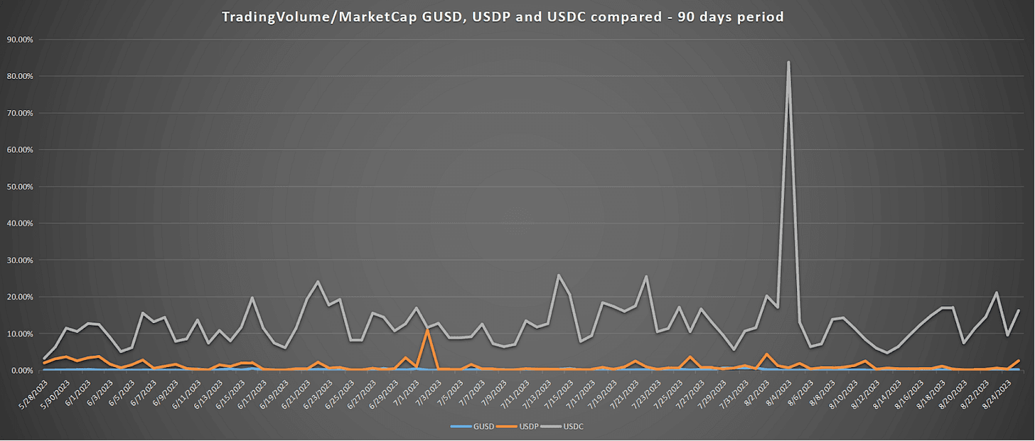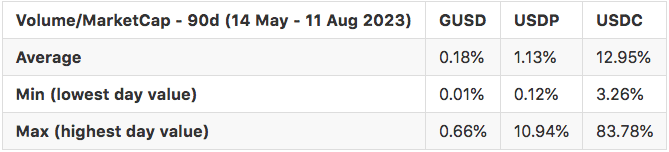 When comparing GUSD’s daily volume/market cap over the 90-day period against two other stablecoins that Maker uses in its DAI PSM (USDC and USDP), we get a better picture of GUSD’s relatively low utilization: