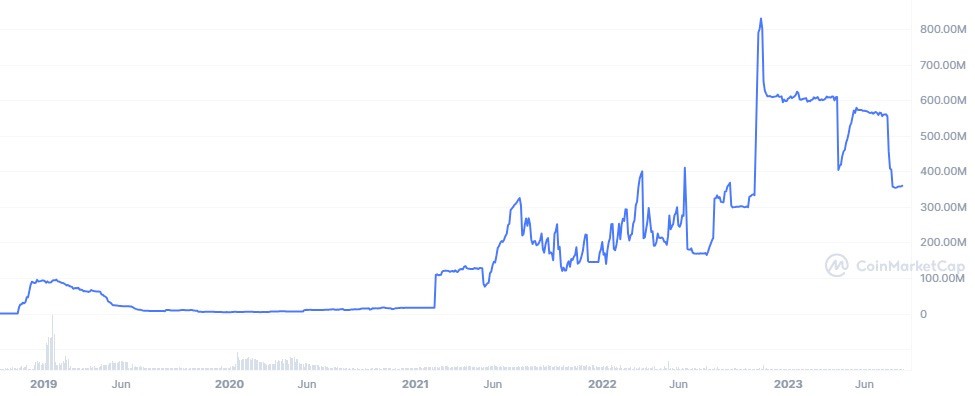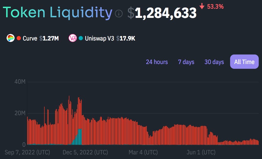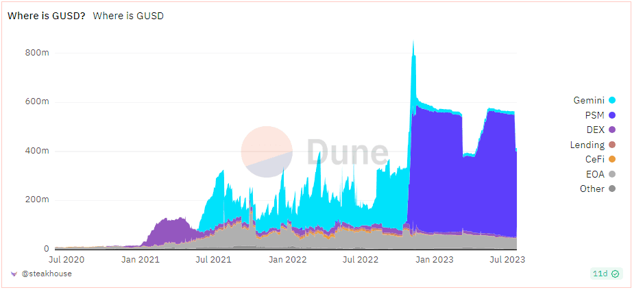 The chart below shows the GUSD market cap over time since its launch in 2018. Of note is the sharp increase upon inception of the MakerDAO partnership and the marked volatility experienced after several bank failures in March and increased uncertainty in the MakerDAO partnership:
