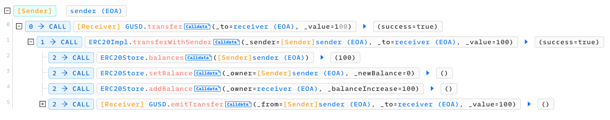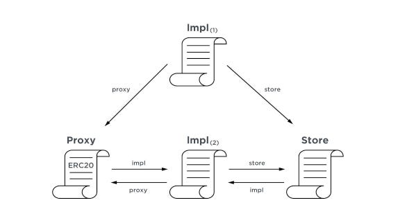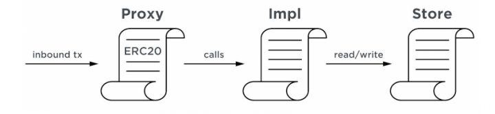For example, calling transfer to the ERC20Proxy will call ERC20Impl.transferWithSender. ERC20Impl updates the token balances of the sender/receiver through erc20Store.setBalance and erc20Store.addBalance, and finally fires a transfer event back to the proxy through erc20Proxy.emitTransfer.