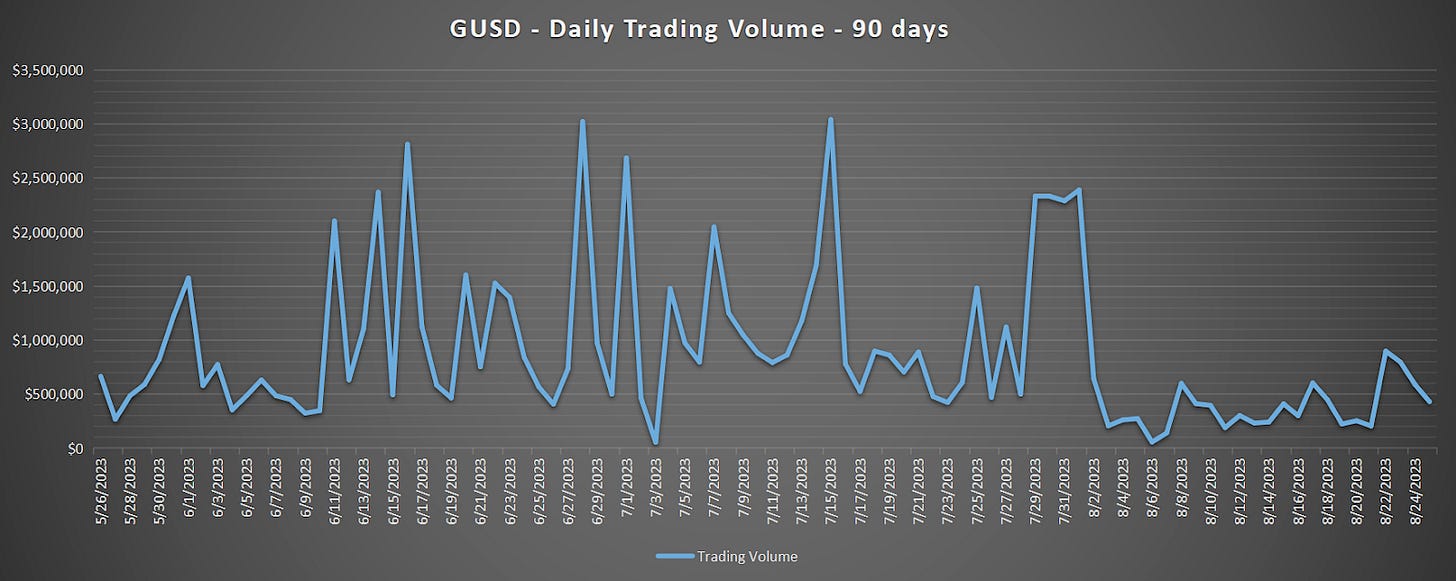 GUSD’s average daily trading volume for the last 90 days is $885,732 with a range from the lowest day of $53,791 to the highest trading volume day of $3,041,917.