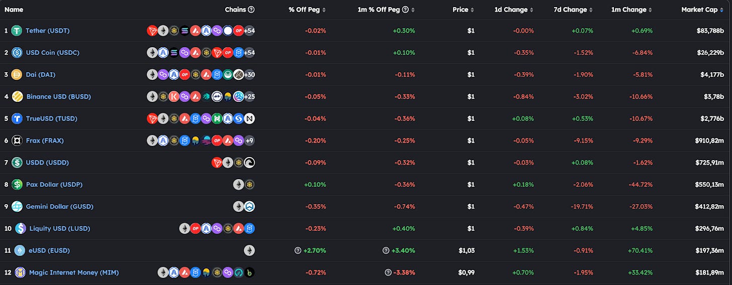 On DefiLlama, GUSD is ranked as the 9th largest stablecoin by market cap with a 0.25% market dominance. The GUSD market cap has been decreasing in the past month compared to competitors and has experienced a max off-peg deviation of -0.74% for that period. As shown below, the off-peg deviation is significant compared to the top 10 stablecoins: