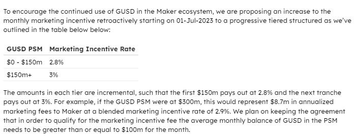 The PSM-GUSD-A became the majority holder of GUSD in November 2022 and has maintained majority status ever since. Gemini began a marketing incentive program in October 2022 that pays MakerDAO a rate based on the quantity of GUSD in the PSM. At inception, Gemini agreed to pay a rate of 1.25% monthly to MakerDAO for GUSD in the PSM, provided that the monthly average in the PSM was at least 100m GUSD. It has continued the program and periodically adjusts the rate to stay competitive. It is currently paying a maximum of 3% on GUSD deposits as of the latest update on July 18th.