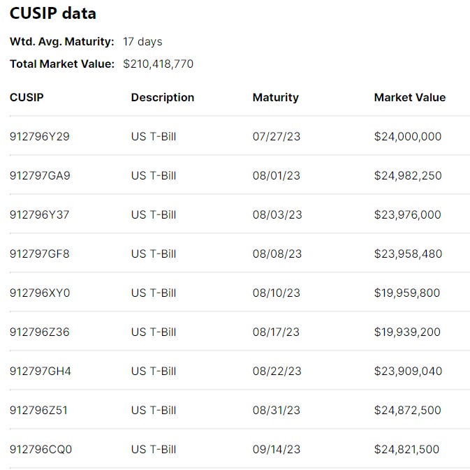 Gemini offers additional details and a more current overview of the GUSD reserves on the Gemini Trust Center page of its website. This includes a complete breakdown of the U.S. Treasury obligations backing GUSD, with specifics such as CUSIP numbers, maturity dates, weighted average maturity, and the total market value of funds. The image below shows the data related to U.S. T-bills, as updated on July 31, 2023: