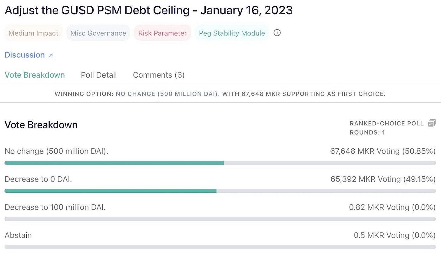 As the MakerDAO PSM contains the majority of GUSD supply and there is relatively low GUSD liquidity on other secondary markets to facilitate arbitrage, there is an additional burden on proper reserves management to facilitate GUSD redemptions. For example, the MakerDAO vote (rejected by a narrow margin) in January to reduce the GUSD PSM max debt from 500m to 0 could have resulted in a large and sudden demand to process redemptions.