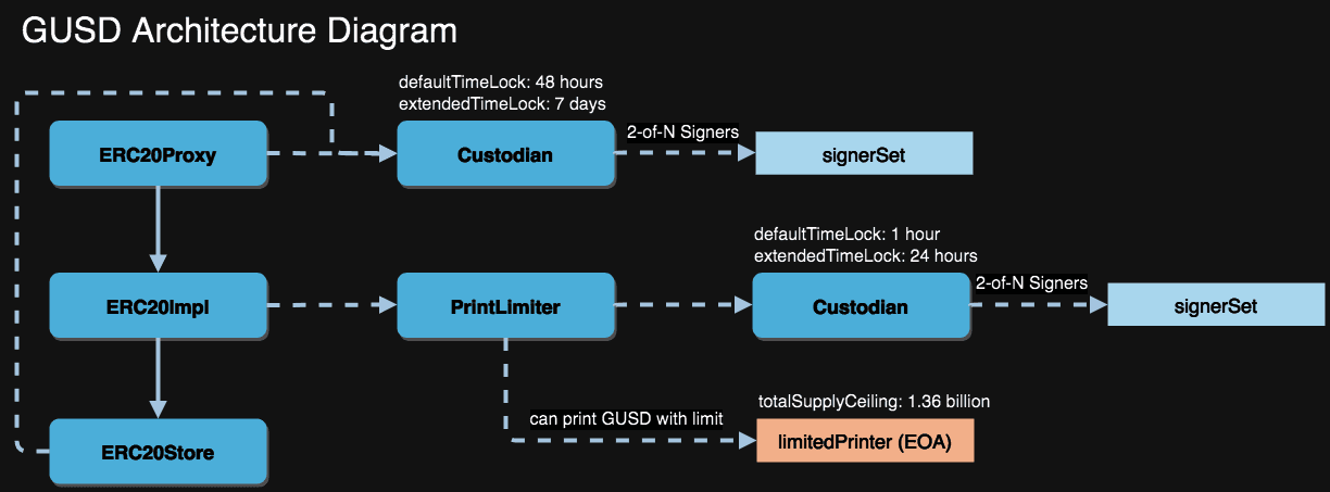 For instance, the ERC20Impl custodian is a PrintLimiter contract that allows an additional key to mint GUSD up to a predefined ceiling that can only be increased by the PrintLimiter’s own Custodian. The Custodian is set with a 60-minute defaultTimeLock when called by the designated Primary address (EOA), or an alternative 24-hour extendedTimeLock if called by another address. The contract requires 2-of-N members of the signerSet to approve actions that include contract upgrades and increasing the token supply.