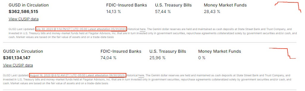The Trust Center data shows that there has been a significant reallocation of financial instruments inside the GUSD reserve portfolio between July 30th and August 16th, 2023. In the 17-day period, cash deposits held in FDIC-Insured banks were increased from 14.13% to 74.04% of the overall portfolio, U.S. T-bills were reduced from 57.44% to 25.96%, and exposure to MMFs was reduced from 28.43% to 0%.