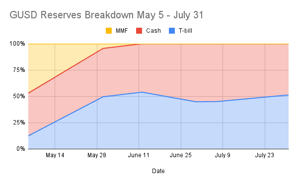 Below is a breakdown of the GUSD reserves portfolio since May, according to the monthly attestation reports. The allocation to MMFs has been removed in favor of U.S. T-bills: