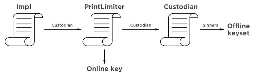 To increase the minting limit, approval must be obtained from an offline keyset (ie. the PrintLimiter’s custodian). Conversely, limit decreases can be authorized by the online key (ie. the limitedPrinter EOA). See the access control relationship between the various contract layers and privileged addresses below: