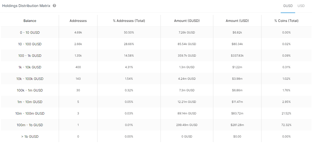 As shown in the data table below, of the approximate 310 million GUSD supply, over 98% of GUSD’s outstanding supply is held by 39 addresses while less than 2% is distributed across the other 9,252 addresses.