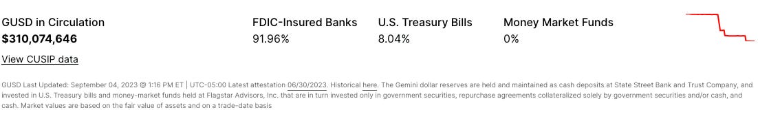The majority of GUSD is currently on MakerDAO, holding over 80% of the total supply. As per a recent update on the Gemini Trust Center page, 91.96% of the reserve is held in cash deposits at State Street Bank, or $285,144,644. This equates to roughly $228 million of GUSD in the MakerDAO PSM which is potentially ineligible for FDIC pass-through insurance.