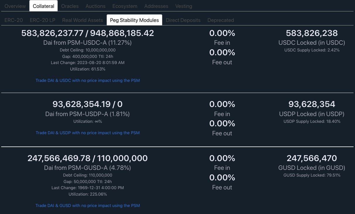 Maker has PSMs for three centralized fiat-backed stablecoins: USDC, GUSD, and USDP. The USDP PSM had its debt ceiling set to 0 in May, allowing users to only withdraw USDP in exchange for DAI. The debt ceiling for USDC is 10 billion versus only 110 million for GUSD. Note in the image below that GUSD in the PSM is also in excess of its debt ceiling, allowing only outflows of GUSD at this time.