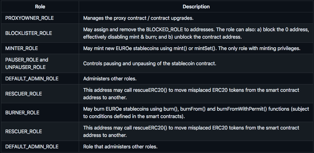 EUROe’s smart contracts are managed in-house with security protocols to restrict unauthorized access to critical roles. As part of those security measures, Membrane utilizes Multi-Party Computation (MPC) technology enabled by Fireblocks. As a result, the privileged roles appear on-chain as EOA accounts.