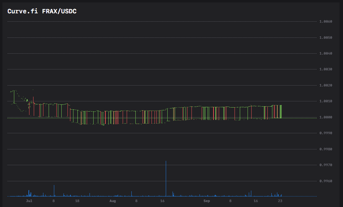 More recently, FRAX has traded between $0.9995 and $1.0020 in the FRAX/USDC Curve pool. Yet this spread can further tighten if the pool’s transaction fees are reduced to 1bp, matching the 3pool.
