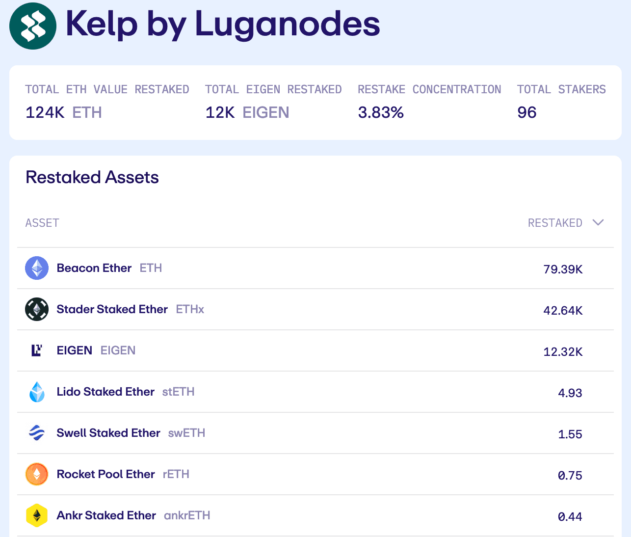 KelpDAO offers native ETH re-staking, allowing users to deposit ETH and receive rsETH in return. Like many liquid staking protocols, KelpDAO delegates the operation of its ETH validators to professional node operators. They currently work with three: Kiln, Allnodes, and more recently Luganodes.