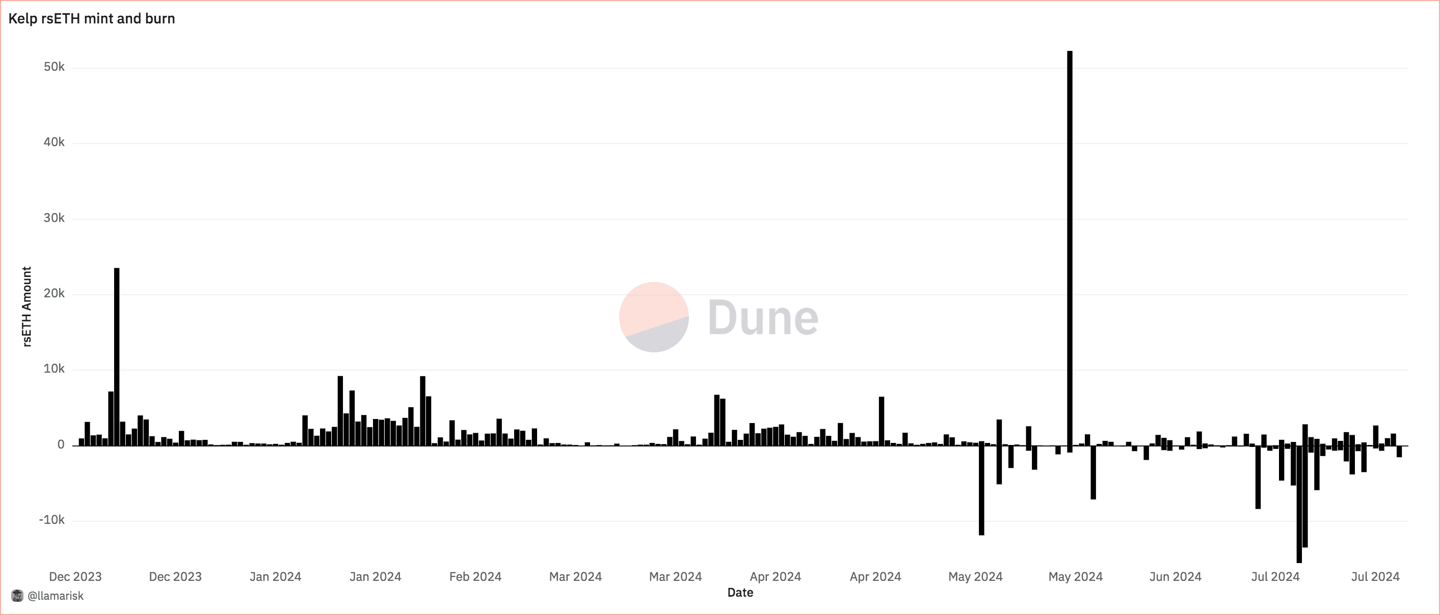 Until mid-April 2024, the rsETH supply has continuously increased; it has seen some large burn events ever since.