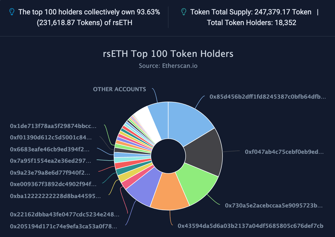 The on-chain liquidity for rsETH is relatively good, with multiple integrations and liquidity venues. The minted rsETH is also relatively spread out among wallets and protocols, with no single EOA concentrating a significant portion of the supply. Top holders include LayerZero, a Zircuit re-staking pool, and a Pendle rsETH fixed-rate market. Liquidity pools with rsETH are either paired with WETH, ETH, ETHx from Stader, or weETH from EtherFi.