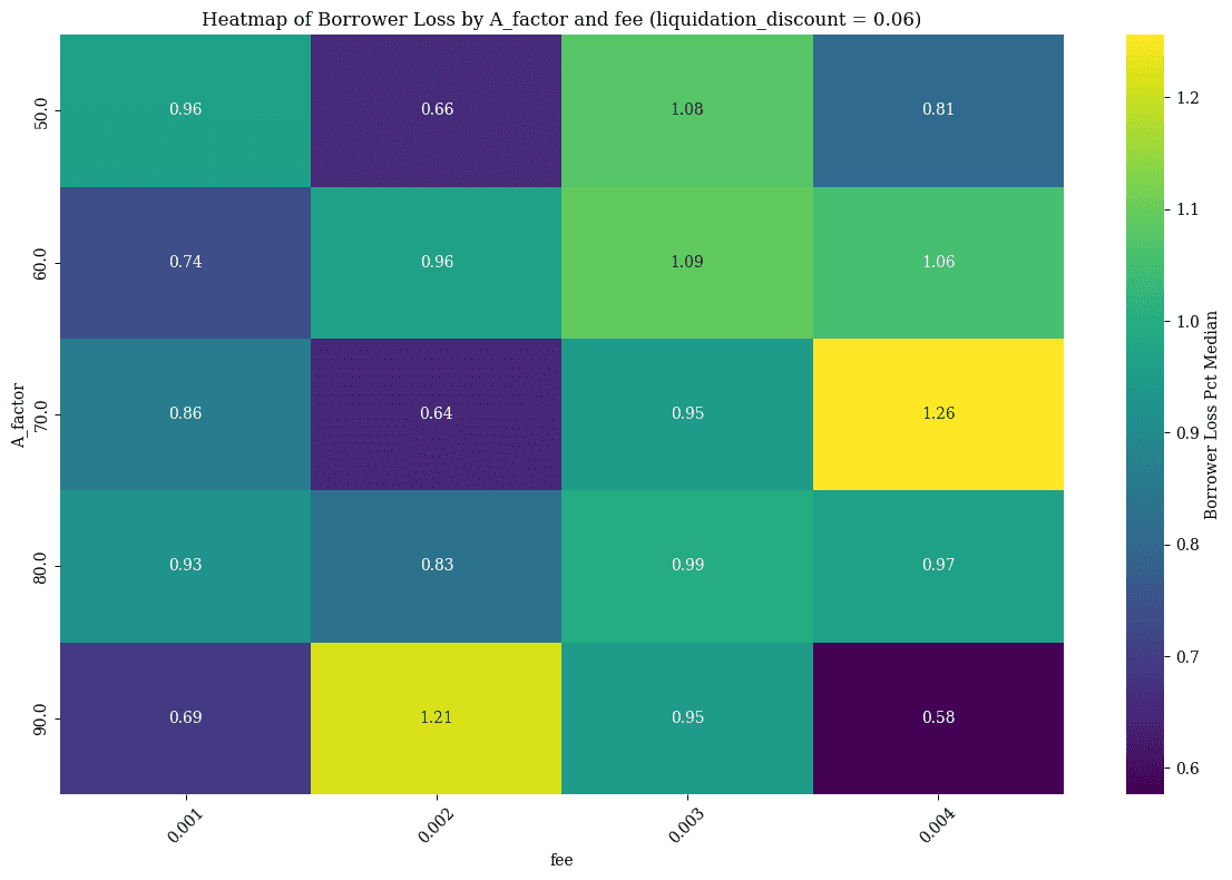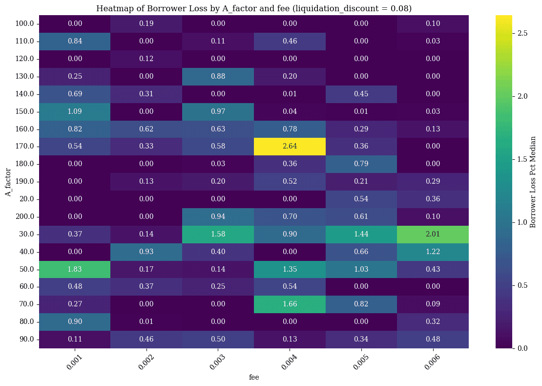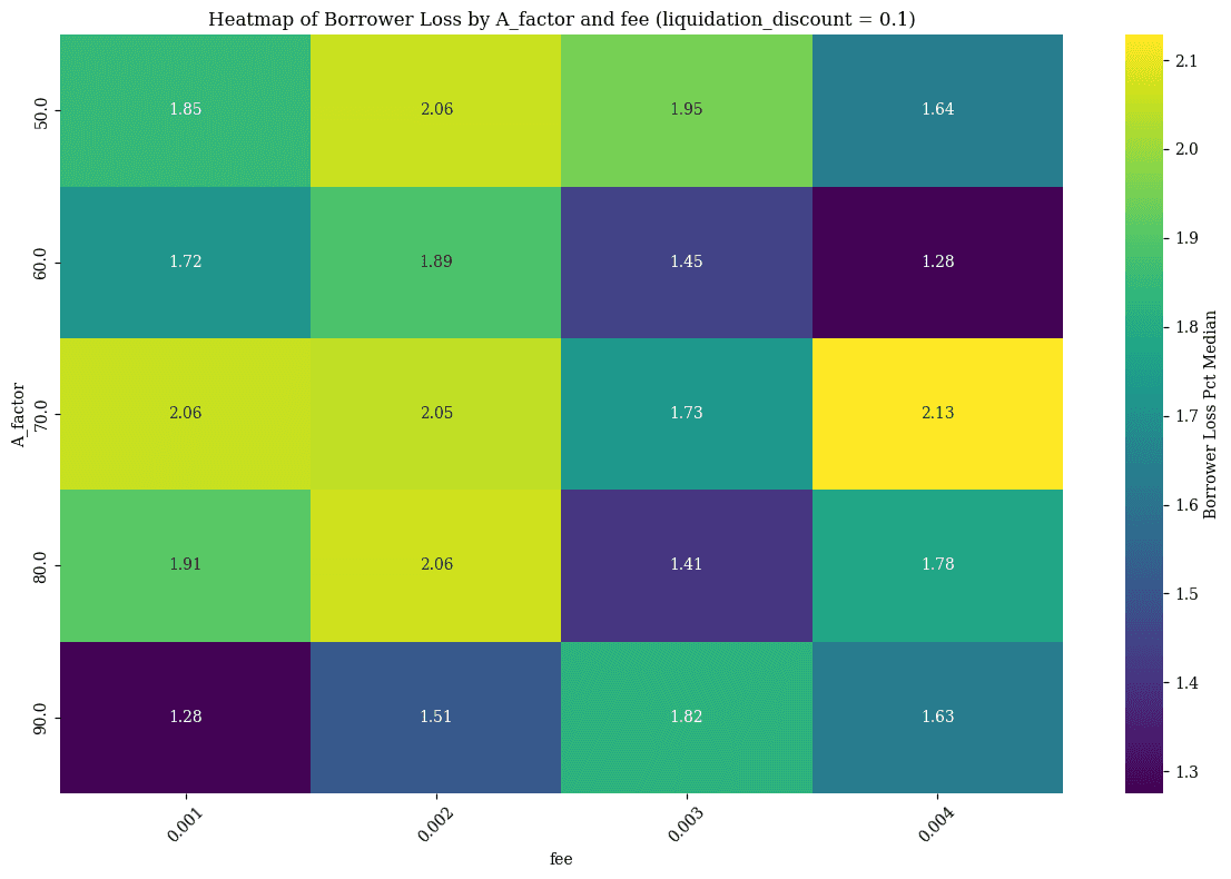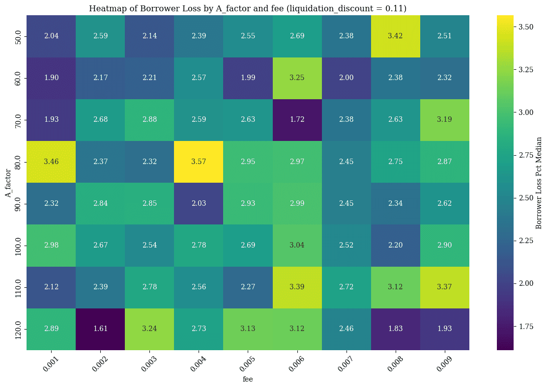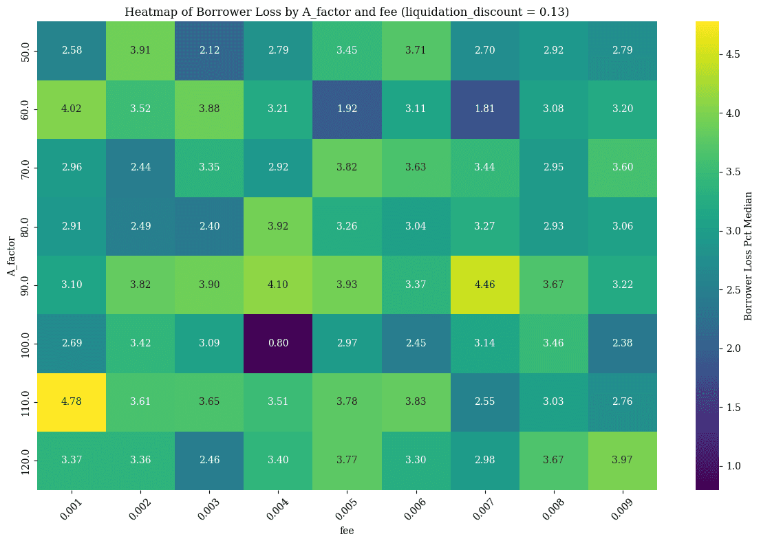 Referencing against llama-simulator, the above fee range again proves to be optimal. An A factor of ~65 with a liquidation discount of 0.09-0.1 was found to result in least borrower losses.
