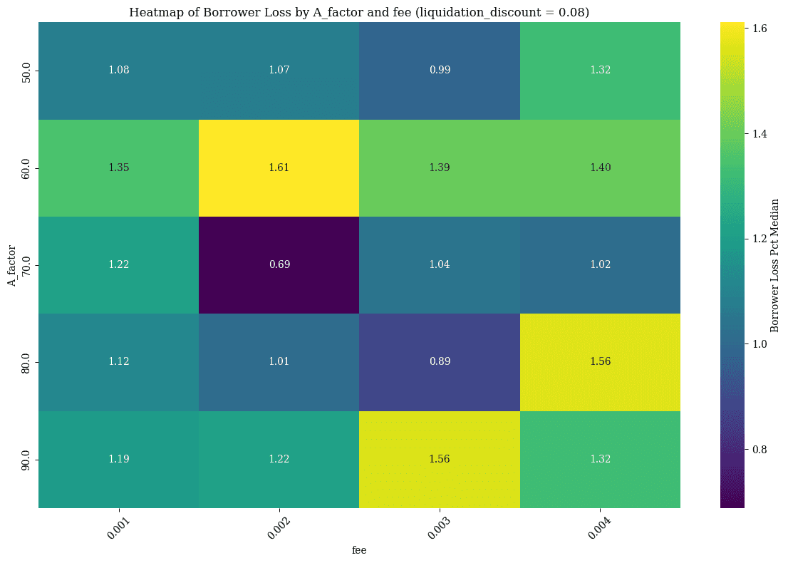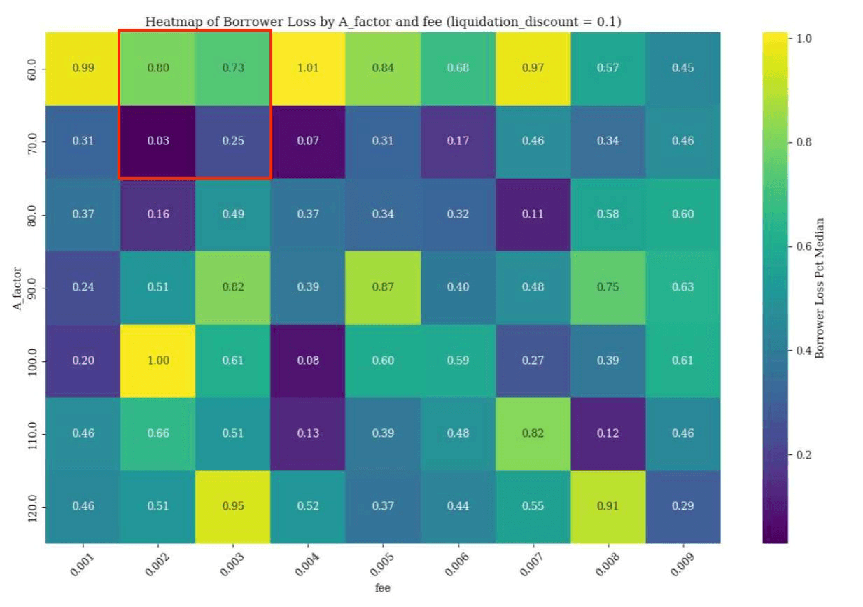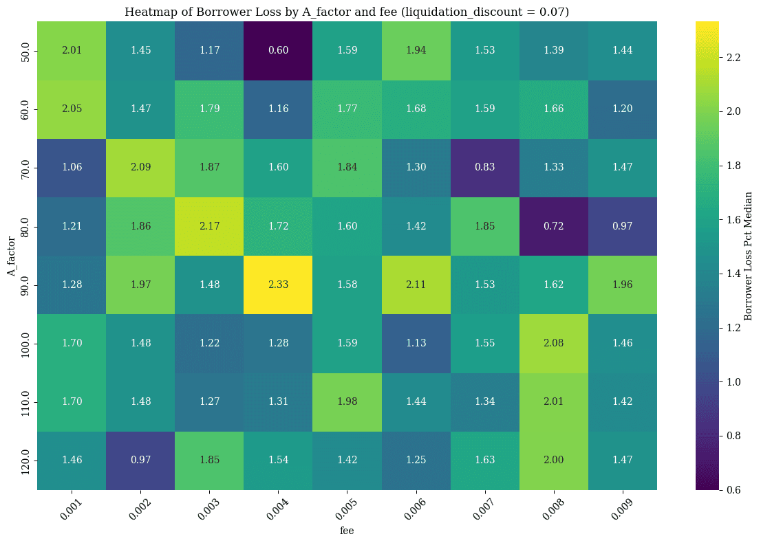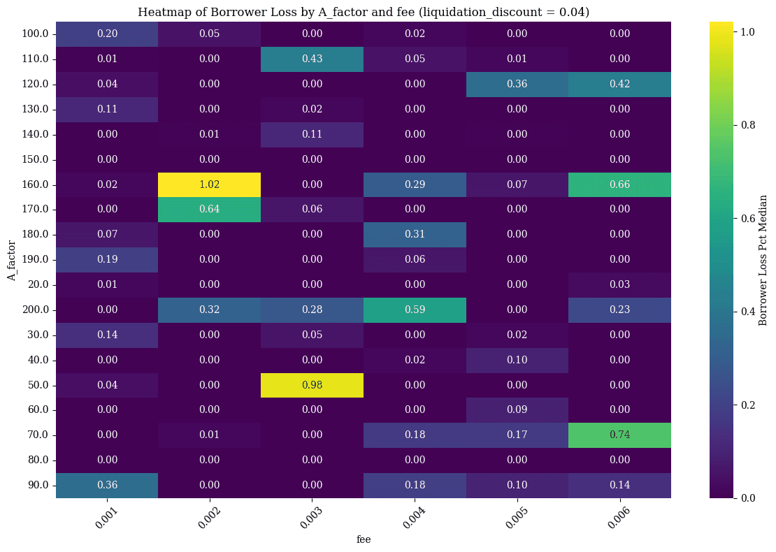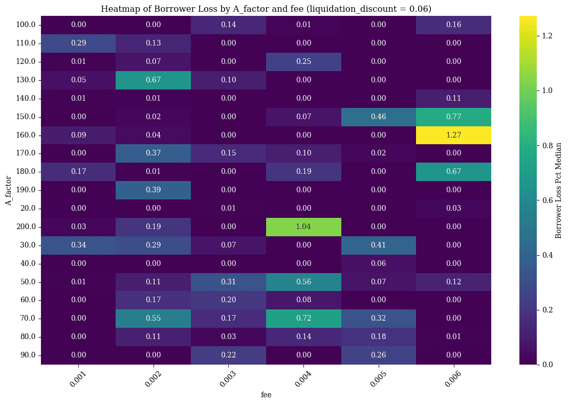 Referencing against llama-simulator, the above fee range again proves to be optimal. An A factor of ~65 with a liquidation discount of 0.09-0.1 was found to result in least borrower losses.