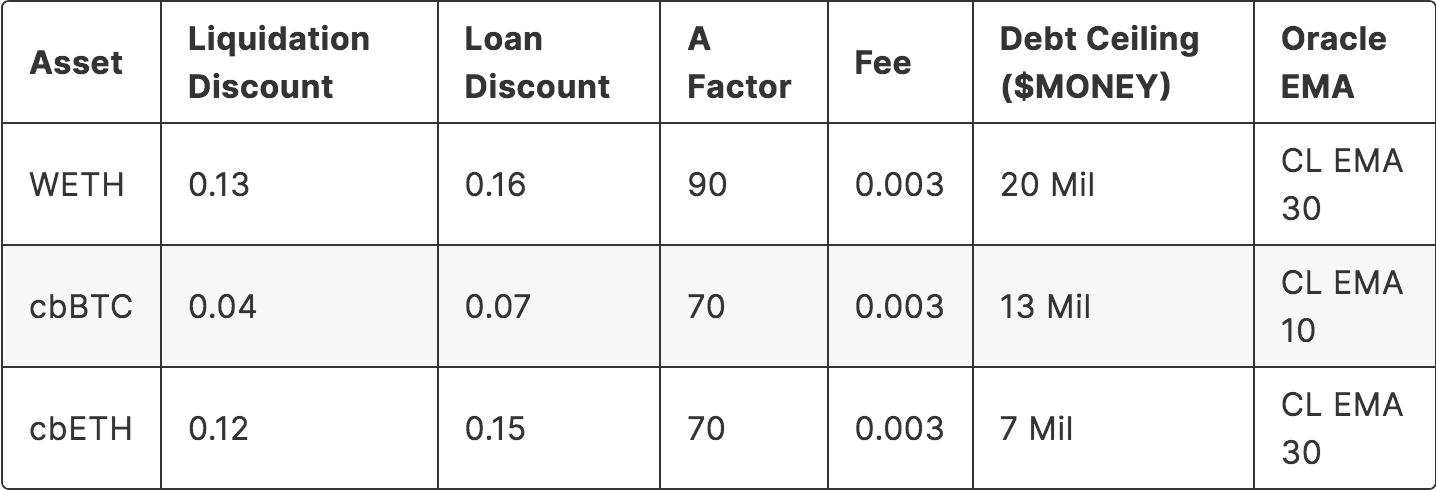 Our conclusion is to onboard WETH, cbBTC, and cbBTC initially with wstETH onboarding to follow in the near future. In general, we have found Base chain to offer a good selection of high quality assets with deep liquidity to support Defi.money markets. The aforementioned assets are, in our opinion, the strongest contenders, and we intend to review additional collateral types in the coming weeks.